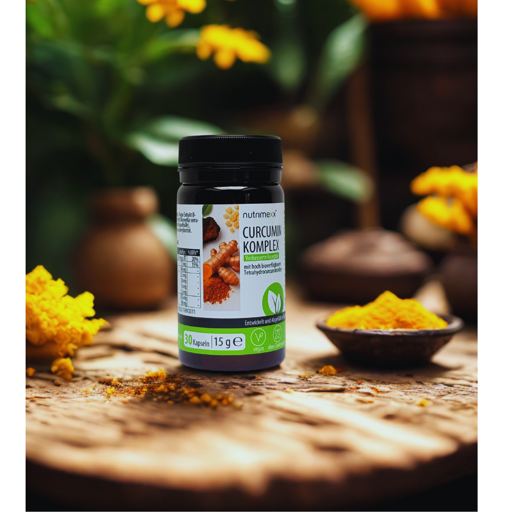 Der Curcumin Komplex vereint bioaktive Pflanzenextrakte mit antioxidativ wirkenden Vitaminen. Im Mittelpunkt steht eine innovative Form bioverfügbarer Tetrahydrocurcuminoide, gewonnen aus Curcuma longa. Diese spezielle Curcumin-Form zeichnet sich durch eine besonders gute Aufnahmefähigkeit im Körper aus.